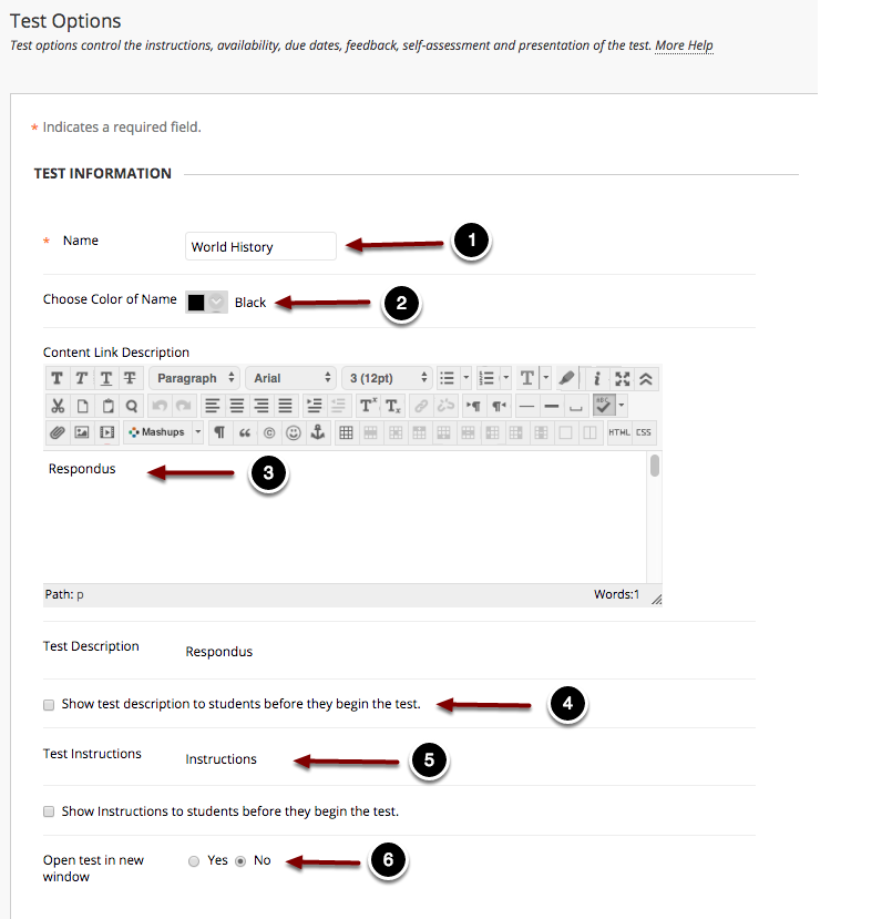 - Test Description: The description that was created when setting up the test questions in Blackboard will appear here. If a test description was not created, this item will not appear. To make the description visible to students prior to starting the test, check the box for the option labeled Show Test Description to students before they begin the test.