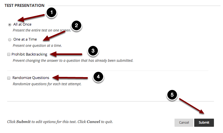 - When finished, click the Submit button at the bottom of the page to save the test settings and make the exam available to students.