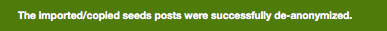 Upon completion of the de-anonymization process, you will see a green confirmation message that reads "The imported/copied seeds posts were successfully de-anonymized."